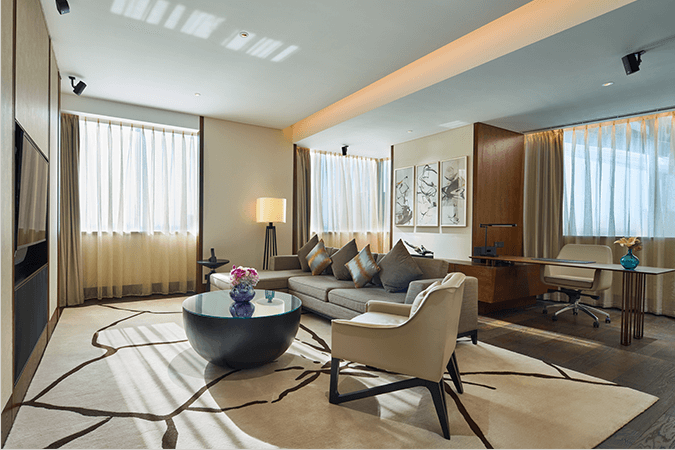 536间客房装饰豪华精美,48寸大屏幕液晶电视、BOSE及PHILIPS音响系统等现代设施一应俱全。别致的花洒和独立浴缸设计,特别配备的高端品牌沐浴产品给您带来非凡怡人的沐浴享受